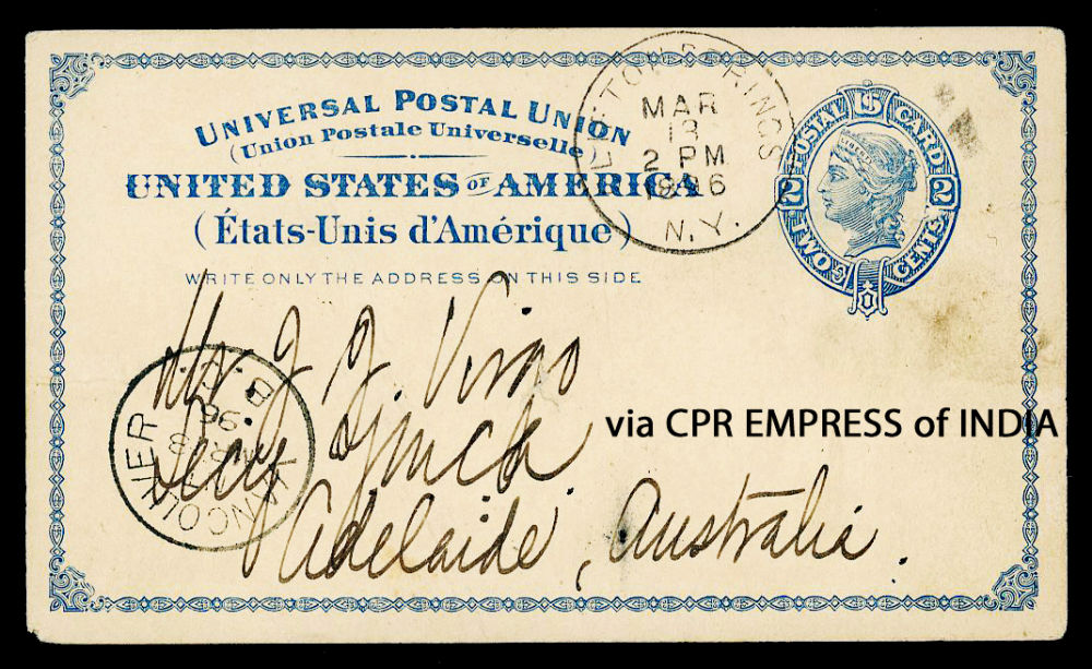 396 image1896 USA to AUSTRALIA via CPR EMPRESS LINES, a UPU card from LIFTON-SPRINGS-NY on MAR-13-1896 and addressed to the YMCA secretary at Adelaide-SA, routing via rail to Vancouver on MAR-18 then CPR Lines SS EMPRESS of INDIA departing MAR-31 by closed bag via Hong-Kong on APR-21 with Adelaide arrival APR-24, a scarce USA routing retailing at least $100 US ($150 CDN), VF est ($75+ US) (Image)