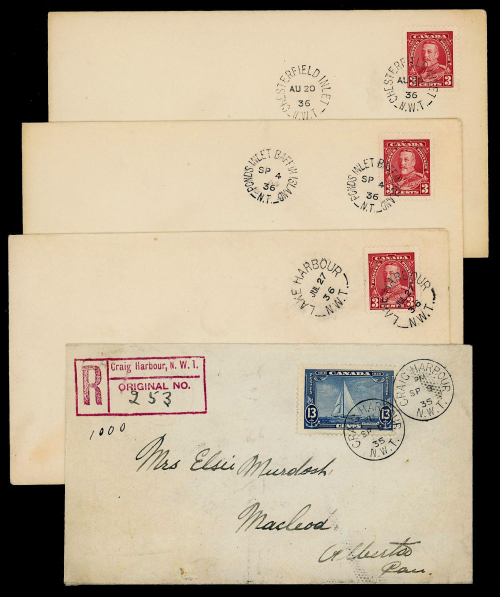 398 image4 ARCTIC SUPPLY "SS NASCOPI" COVERS 1935-1936, includes a 1935 commercial registered cover from CRAIG-HARBOUT-NWT plus 3 philatelic 1936 covers with NWT mailings from LAKE-HARBOU, PONDS-INLET, and CHESTERFIELD INLET, retails $75 US ($100 CDN), VF est ($50+ US) (Image)