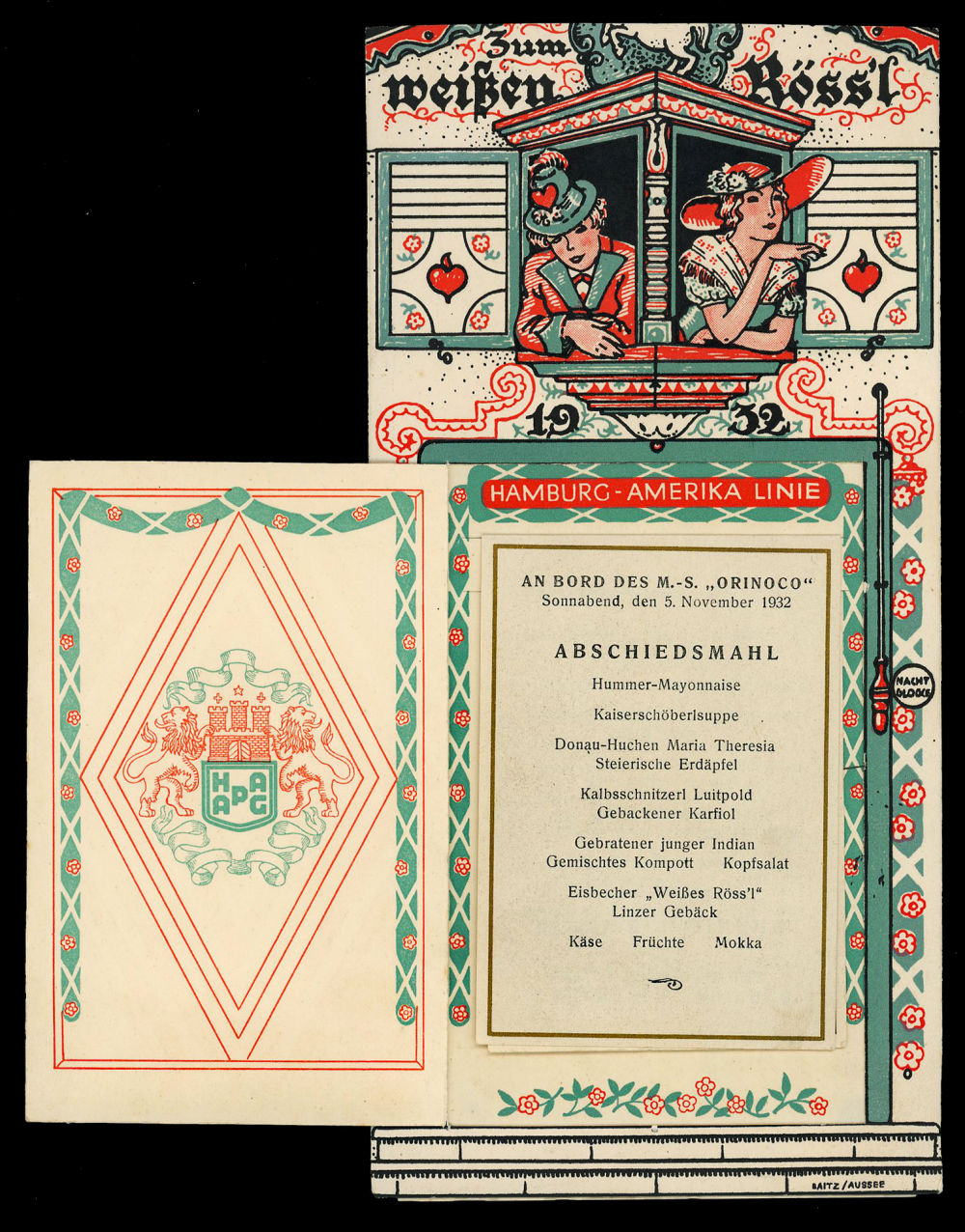 399 image1932 HAPAG "SS ORINOCO" DINNER MENU, a fancy novelty card with a foldout door containing the NOV-5-1932 dinner menu and music program, scarce with retail over $50 US ($75 CDN), VF est ($35+ US) (Image)
