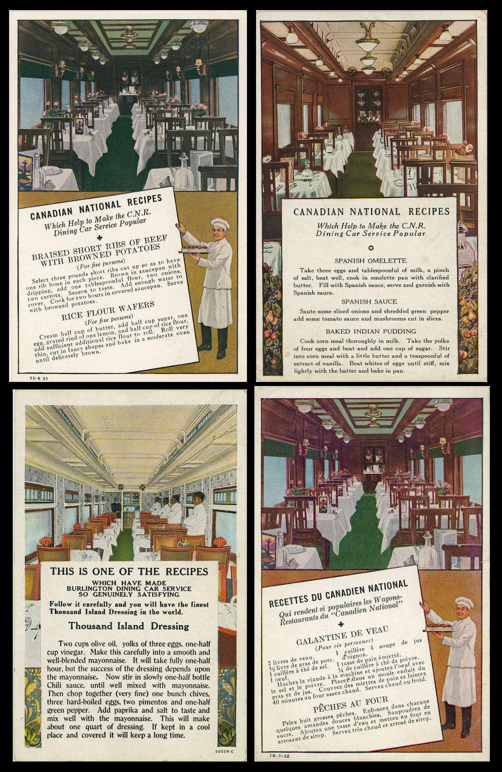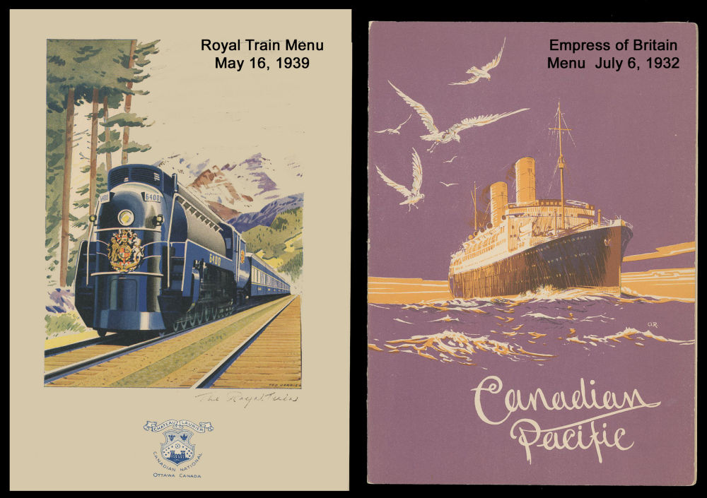 400 image25 SHIP & RAILROAD MENU ITEMS 1909-1950's (a few airline menus), includes a 1932 Empress of Britain 3rd class dinner menu, a 1956 CPR Empress of France wine list, CPR Place Viger 1909 lunch menu, a 1926 CPR "MOUNTAINEER" dining car menu, an undated CPR dining car kids menu, CNR Chateau Laurier $2.00 Christmas DEC-25-1943 dinner menu, also 13 CNR recipe cards noting 3 are scarce French versions, 2 Burlington Railroad recipe cards, a MAY-16-1939 CNR Royal Train lunch menu (x3) ++, retails over $250 US ($360 CDN), F-VF est (Image) (image 400b) (All Images)