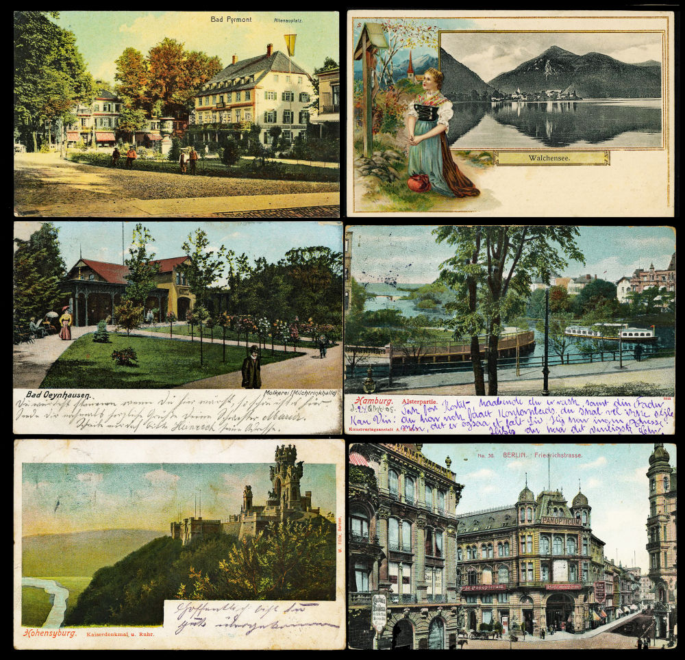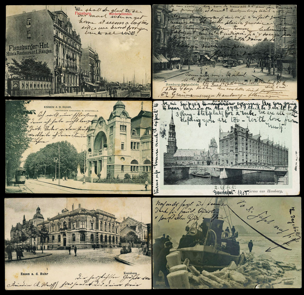 463 image55 GERMAN POSTCARDS 1906-1913 (one later), street and building views noting 29 are postally used, the majority are from smaller towns plus a few from Hamburg, Berlin, and Frankfurt, some nice rates to Canada, USA, England, Denmark, also a 1916 Feldpost card, retails over $640 US ($900 CDN), F-VF est (Image)