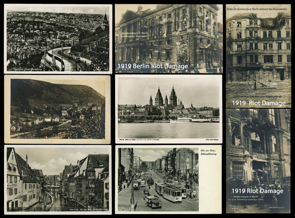 465 image57 GERMAN POSTCARDS 1919-1939 (a few later), the majority are 3rd Reich real photo street and building views from smaller towns, 4 are artist cards including a SEP-1939 Nurnberg patriotic, 4 are scarce MAR-1919 real photo cards showing the Berlin destruction when striking workers fought Government troops (2000 workers died), retails over $300 US ($425 CDN), F-VF est (Image)