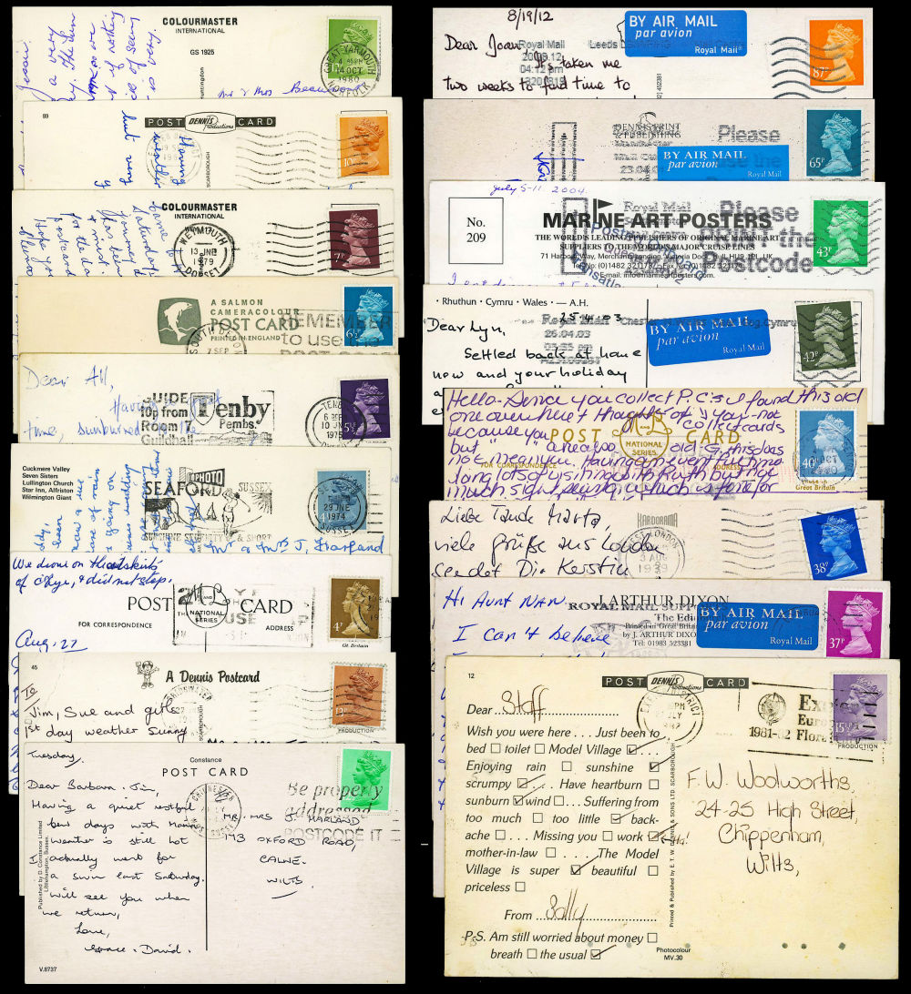 470 image120 GREAT BRITAIN "MACHIN-HEAD" POSTCARD RATES 1967-2006, all different mostly decimal issues with 4p-88p single frankings plus a few earlier Sterling rates and some mixed frankings, all this during the high postal inflation period with many scarce rates, includes 60 Empire rates to Canada, one rate to Hong Kong, and UPU rates to USA, retails over $400 US ($575 CDN), VF est (Image)