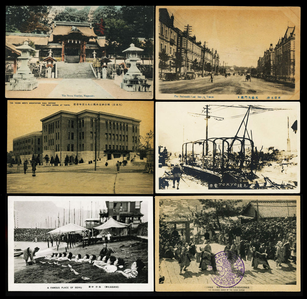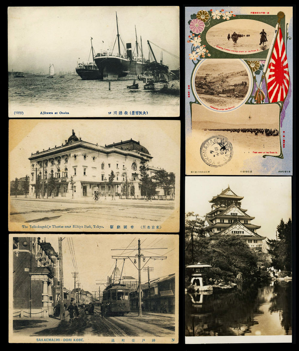 474 image67 JAPAN POSTCARDS 1900-1930's, street and building views including 6 with early pre-1906 undivided back cards, 46 are 1907-1925 cards, and 15 are post-1925, note a scarce 1905 Russia-Japan war patriotic showing General Kuroki crossing the At River and the aftermath of the Battle of Kohmatang, retails over $360 US ($500 CDN), F-VF est (Image) (image 474b) (All Images)