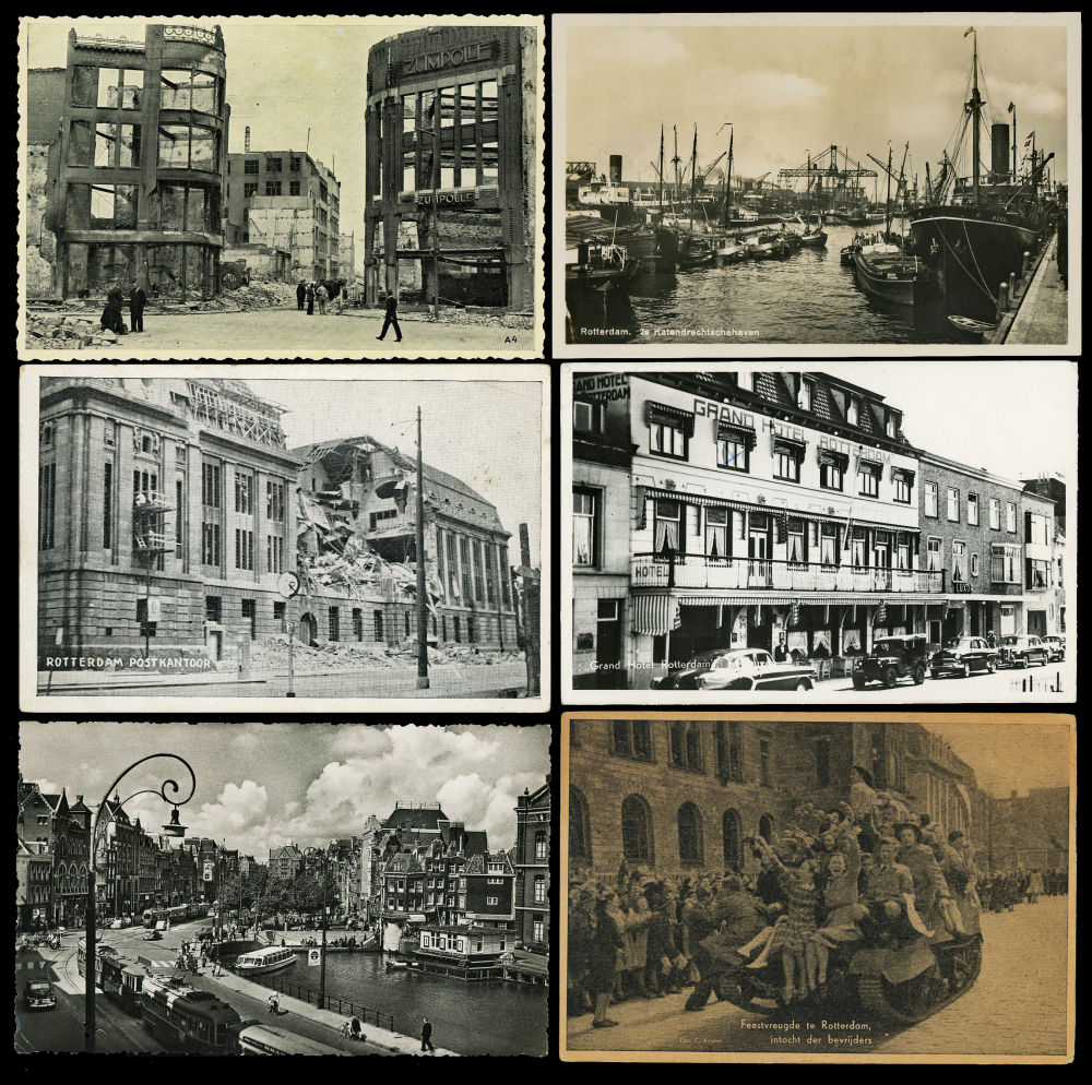 479 image143 NETHERLANDS POSTCARDS 1939-1950's, street and building views, 28 cards are German occupation views including 21 showing war damaged buildings, 4 are WWII Victory celebration cards, 117 cards are post WWII mostly B&W real photo cards, 3 are N.T.R. signed artist cards plus a few Colony cards from Curacao and New Guinea, retails over $390 US ($550 CDN), F-VF est (Image)