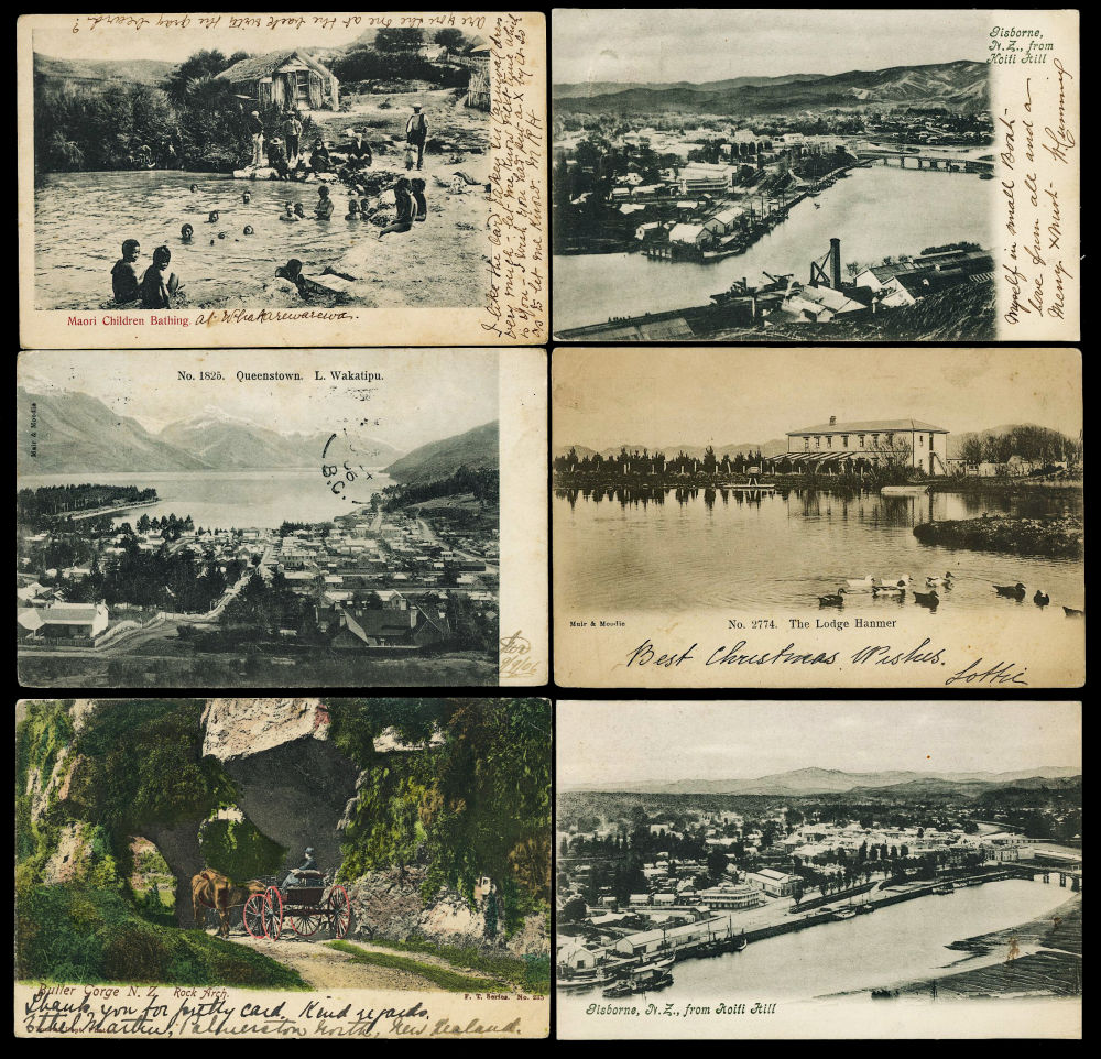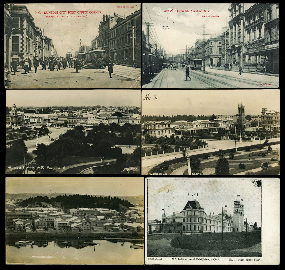 481 image23 NEW ZEALAND POSTCARDS 1905-1906, street and building views on early undivided back cards, 19 are postally used with good rates to Canada, England, and USA, a scarce group for the trans-Pacific mail specialist, retails over $400 US ($575 CDN), F-VF est (Image)
