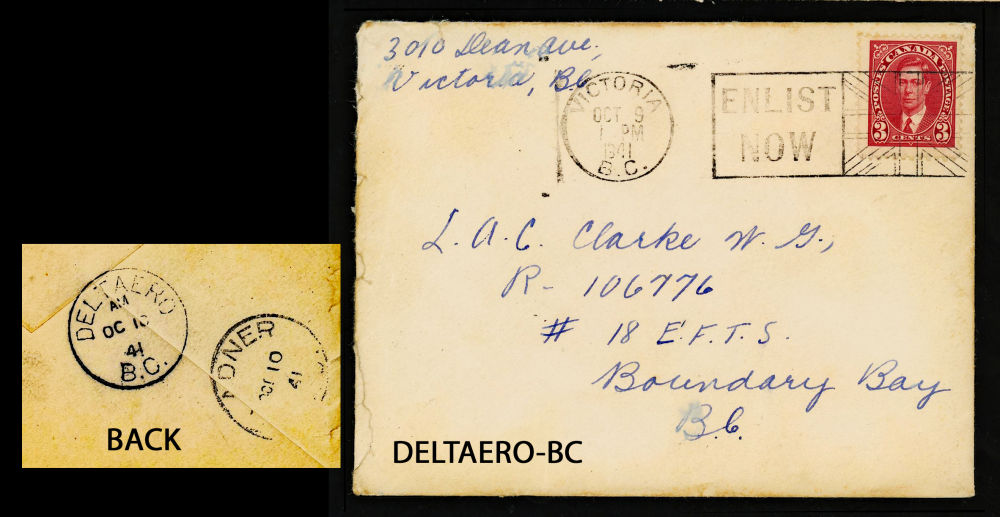 101 image1941 DELTAERO-BC (1941-1942 RF-E), cds receiver dated OCT-10-1941 on cover from Victoria and addressed to an officer at the Military Base at Boundary-Bay, retails $100 US ($150 CDN), F-VF est ($75+ US) (Image)