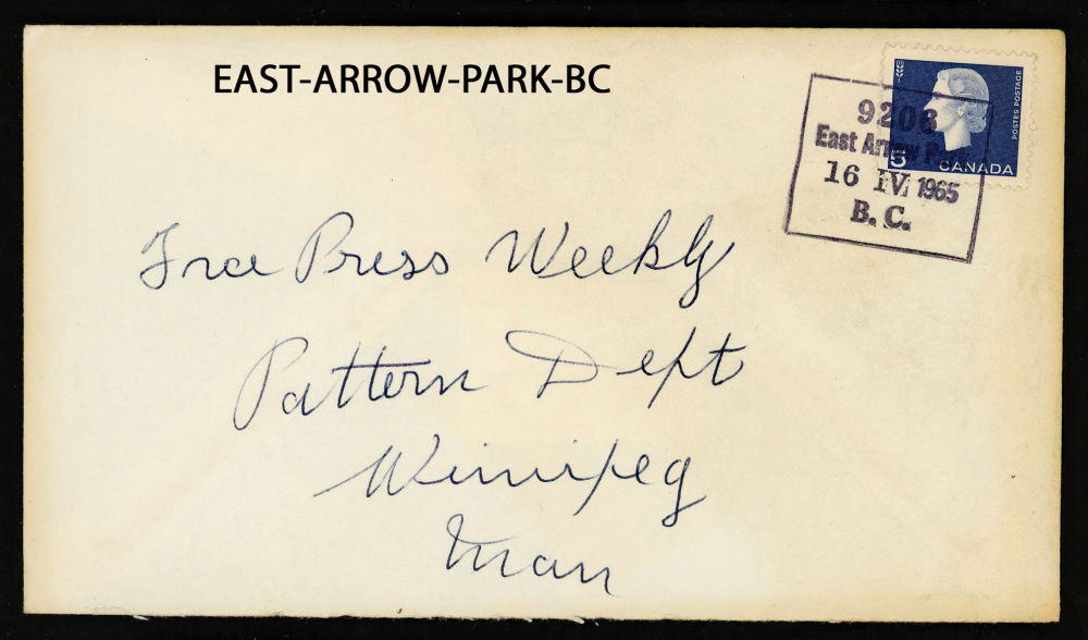 102 image1965 EAST-ARROW-BAY-BC (1913-1969 RF-D), nice use of the MOON-9206 cancel dated APR-16-1965 on cover to Winnipeg, a scarce town retailing $75 US ($100 CDN), VF est ($50+ US) (Image)