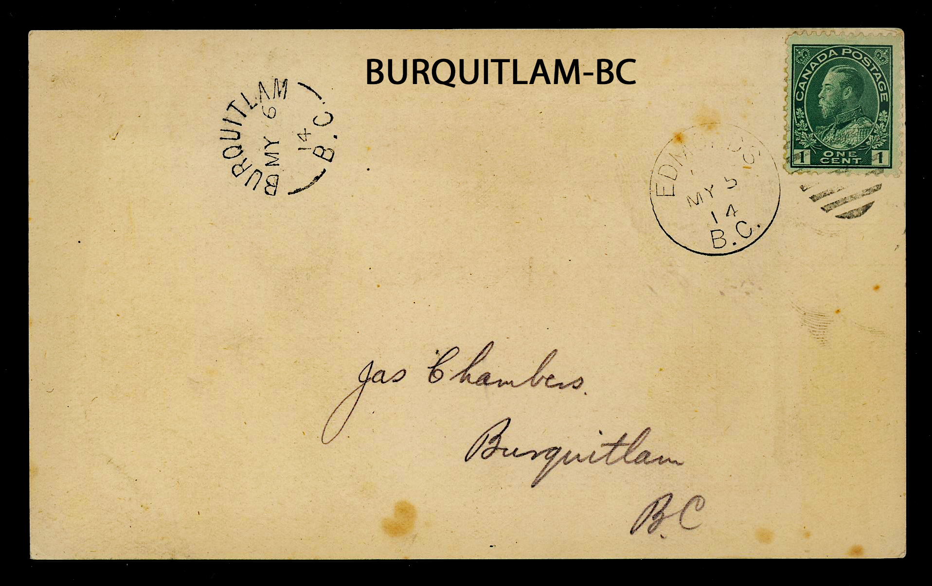 103 image1914 EDMONDS-BC (1909-1919 RF-D), duplex on a Burnaby property tax assessment card dated MAY-5-1914 and addressed to BURQUITLAM-BC with arrival the next day, retails $75 US ($100 CDN), F-VF est ($50+ US) (Image)