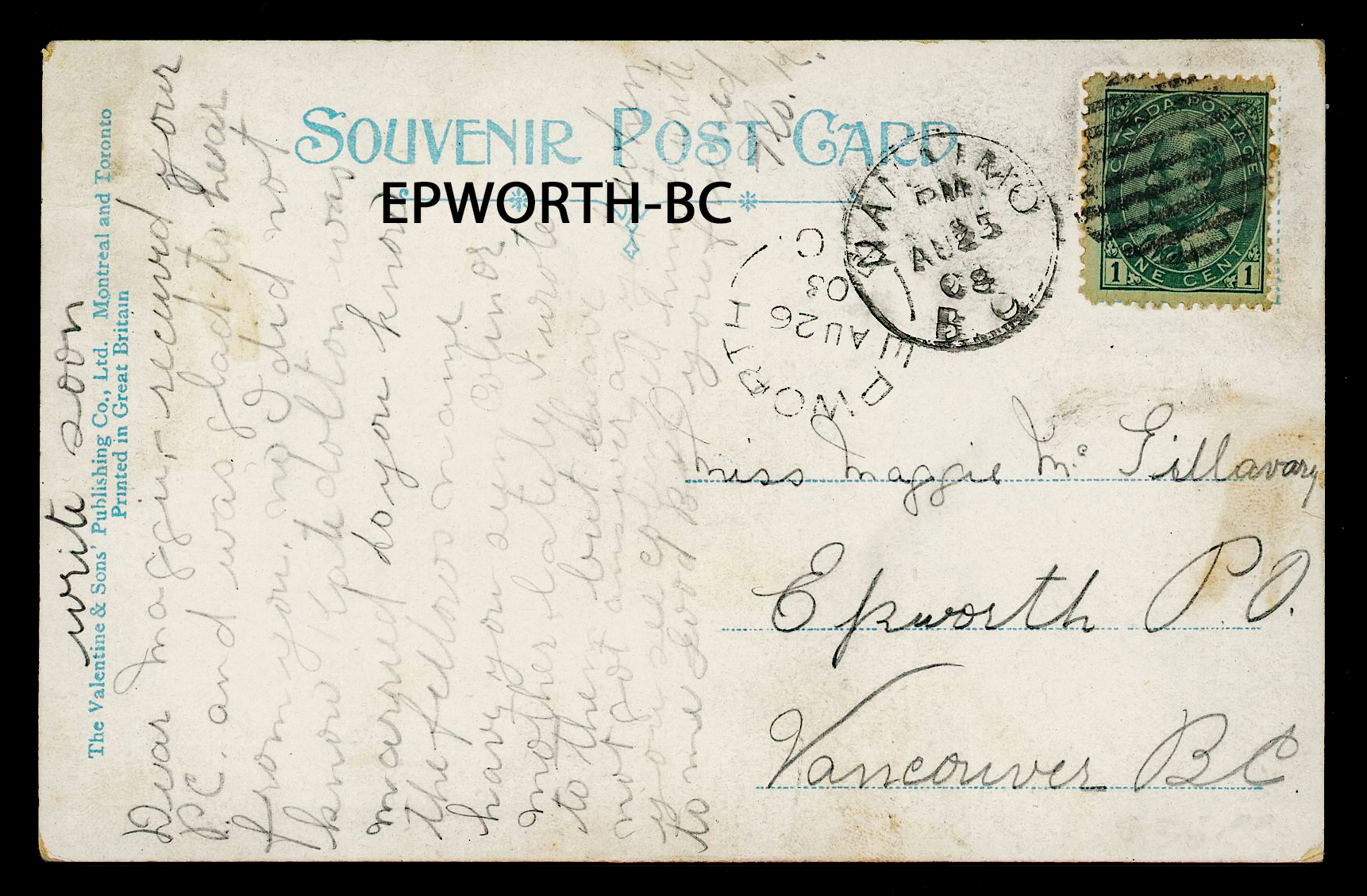 104 image1908 EPWORTH-BC (1896-1909 RF-D), split ring receiver dated AUG-26-1908 on postcard from NANAIMO-BC, retails $75 US ($100 CDN), F-VF est ($50+ US) (Image)