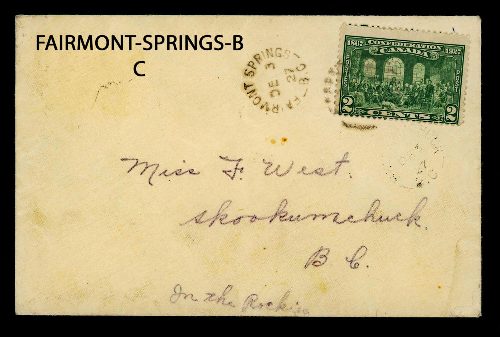 105 image1927 FAIRMONT-SPRINGS-BC (1888-1934 RF-D), split ring on cover dated DEC-3-1927 to Skookumchuck, retails $75 US ($100 CDN), F-VF est ($50+ US) (Image)