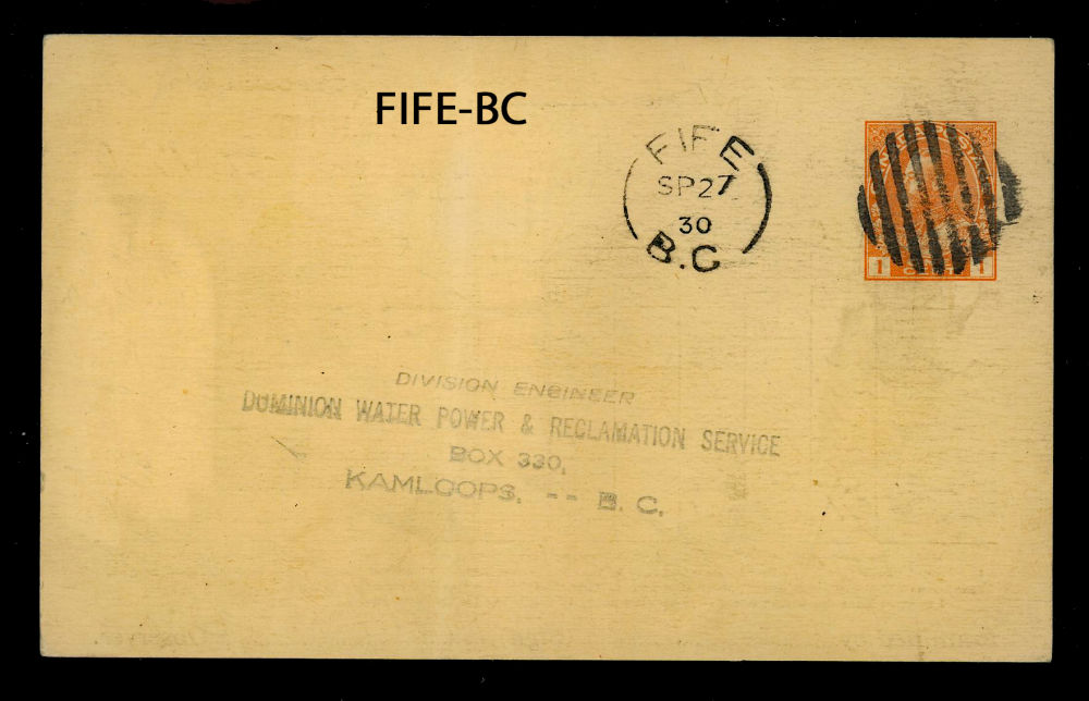106 image1930 FIFE-BC (1900-1966 RF-D), split ring dated SEP-30-1930 on a water survey card to Kamloops, retails $75 US ($100 CDN), F-VF est ($50+ US) (Image)
