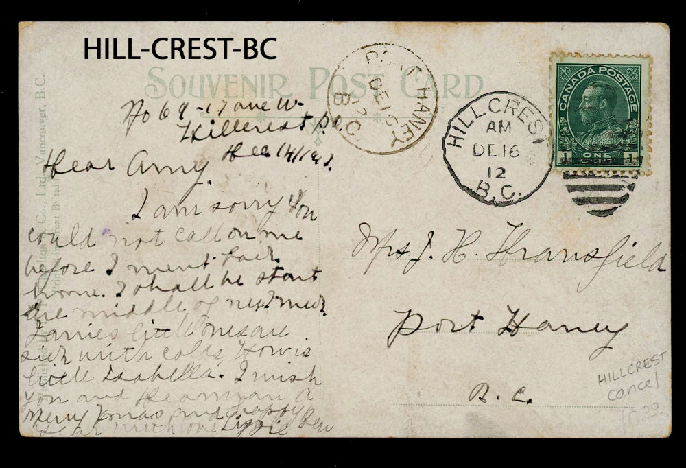 107 image1912 HILL-CREST-BC (1907-1913 RF-D), duplex dated DEC-16-1912 on postcard to Port-Haney, retails $75 US ($100 CDN), F-VF est ($50+ US) (Image)