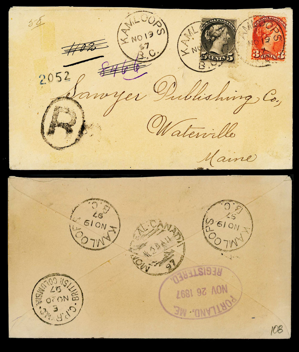 108 image1897 KAMLOOPS-BC 8¢ REGISTERED to USA, posted on NOV-19-1897 and addressed to Waterville-Maine, routing via RPO C.P.Ry. MC. BRTISH COLUMBIA (Gray #RY-21 1885-1899) on NOV-20 + MONTREAL on NOV-24 + Portland-Maine oval NOV-26, retails $75 US ($100 CDN), VF est ($50+ US) (Image)