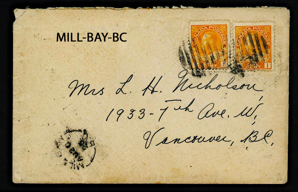 109 image1926 MILL-BAY-BC (1914-1951 RF-D), split ring dated AUG-20-1926 on cover to Vancouver, retails $75 US ($100 CDN), F-VF est ($50+ US) (Image)