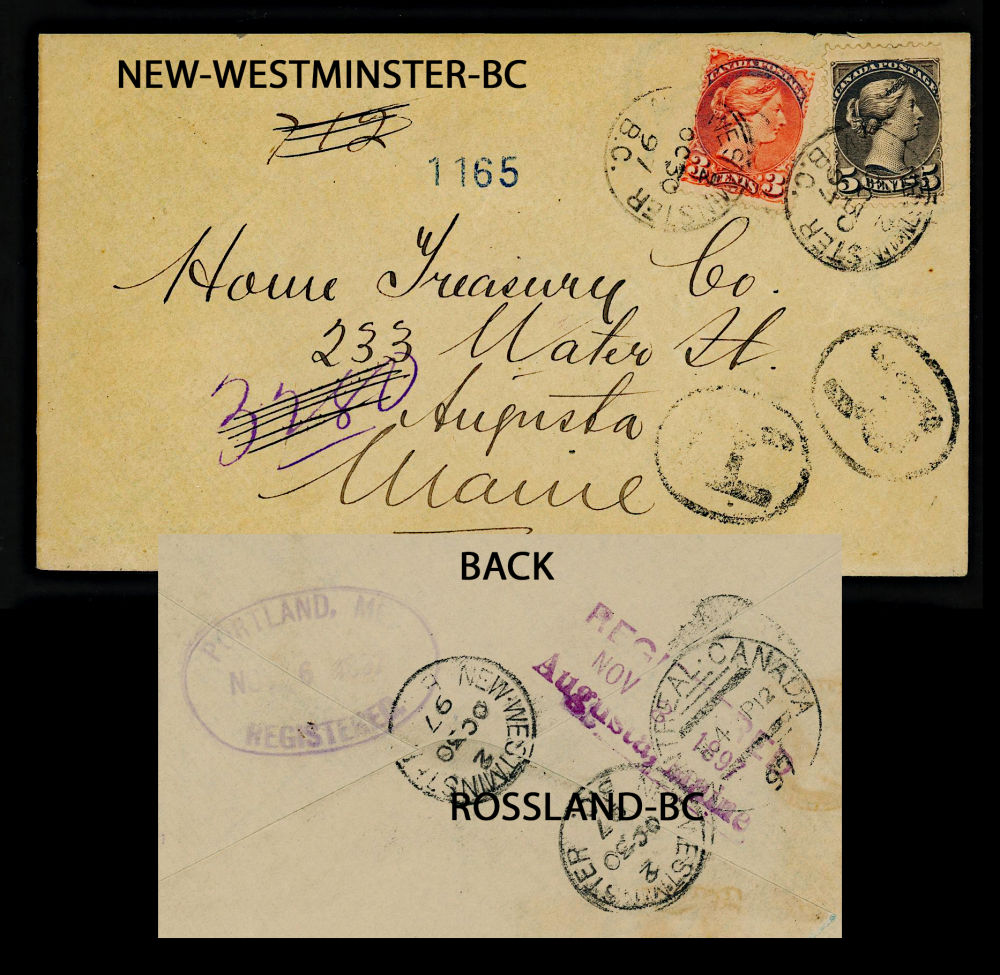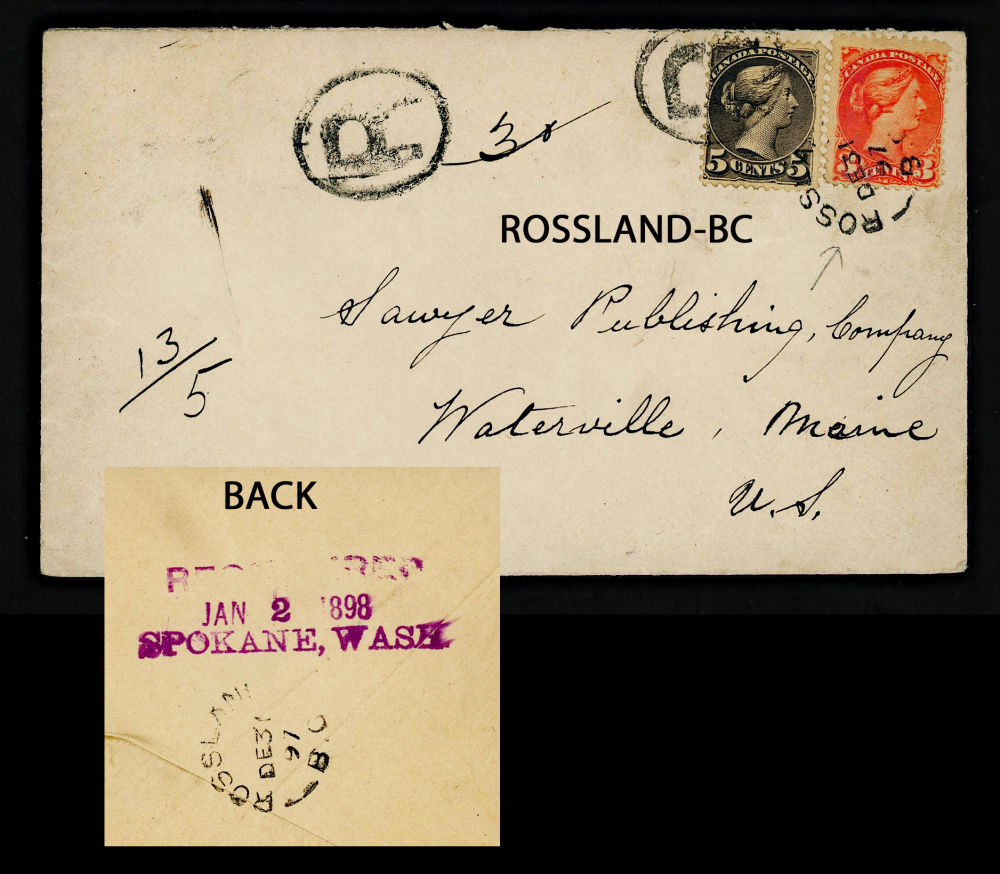 111 image1897 ROSSLAND-BC 8¢ REGISTERED to USA, posted on DEC-31-1897 to Waterville-Maine with routing via SPOKANE-WASH-REGISTERED red transit on JAN-2-1898, nice delivery over New Year, retails $75 US ($100 CDN), VF est ($50+ US) (Image)