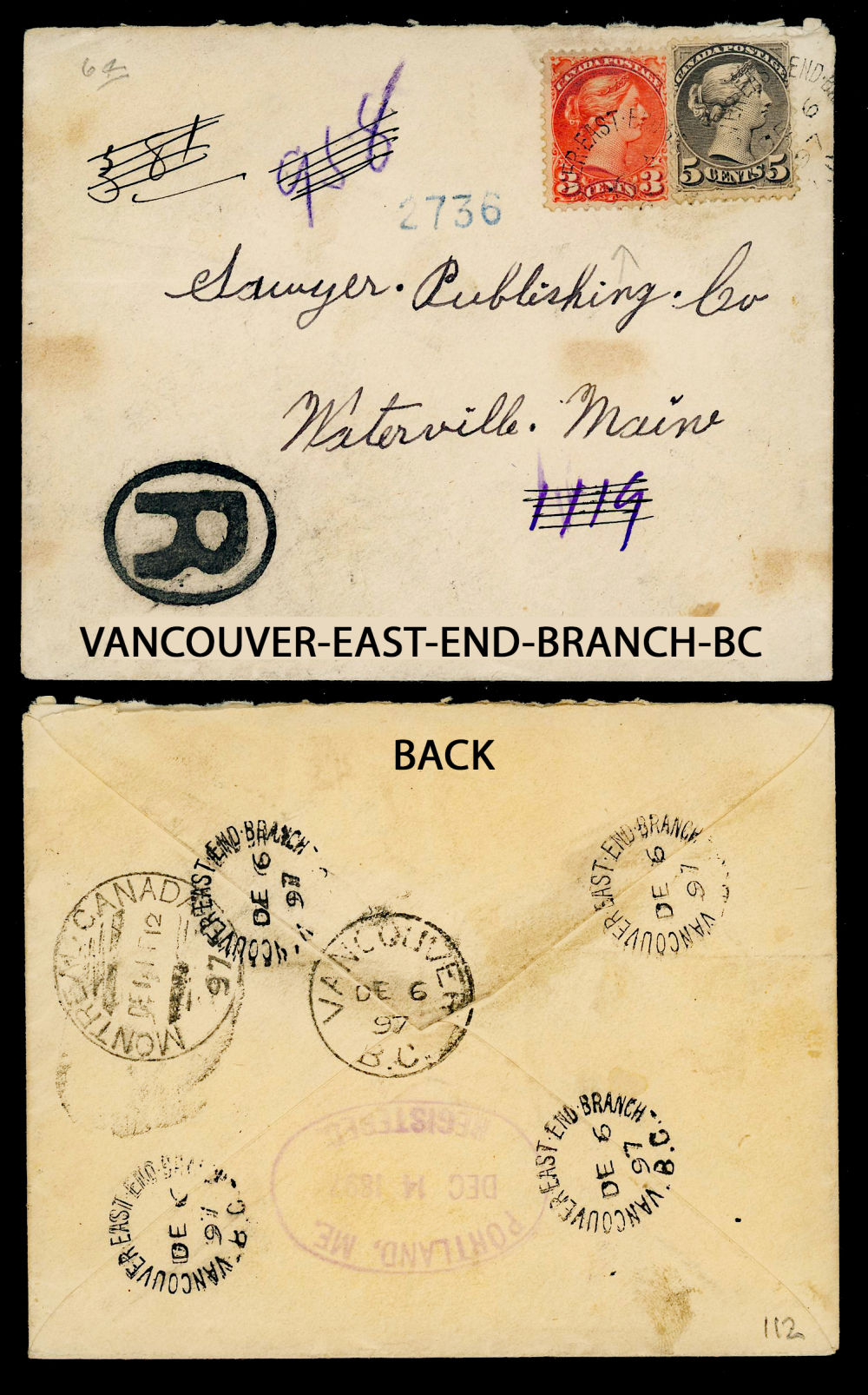 112 image1897 VANCOUVER-EAST-END-BRANCH-BC 8¢ REGISTERED to USA (1897-1914 RF-D), split ring dated DEC-6-1897 on cover to Waterville-Maine, routing via MONTREAL on DEC-12 + Portland-Maine oval DEC-14, retails $75 US ($100 CDN), VF est ($50+ US) (Image)