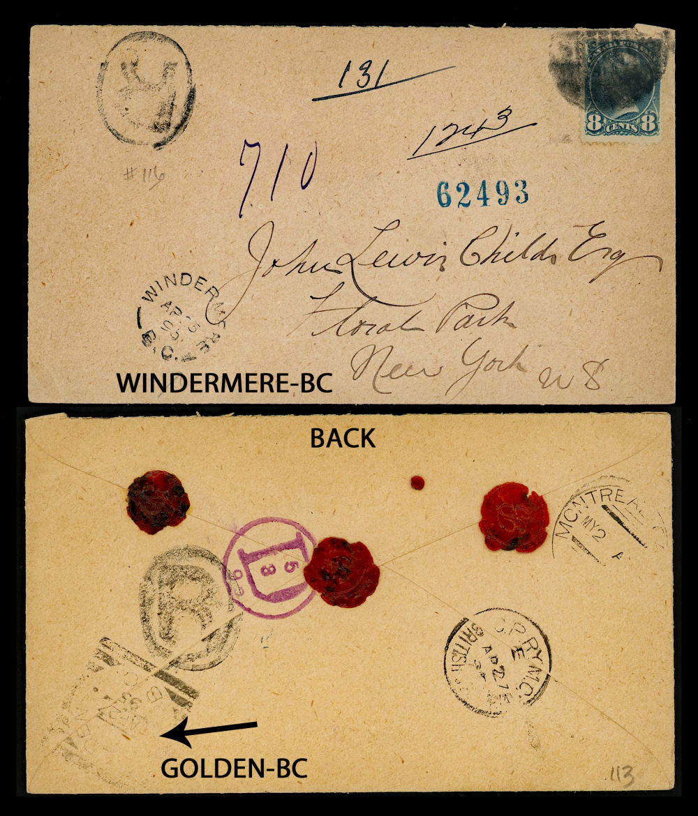 113 image1895 WINDERMERE-BC 8¢ REGISTERED to USA, posted APR-25-1895 and addressed to New York, routing via C.P.Ry. MC. GRITISH COLUMBIA (Gray #RY-21 1885-1899) + GOLDEN-BC on APR-27 with a light squared circle cancel (RF-55) + MONTREAL on MA+B131Y-2 + New-York-Stn-D arrival MAY-8, retails $75 US ($100 CDN), F-VF est ($50+ US) (Image)