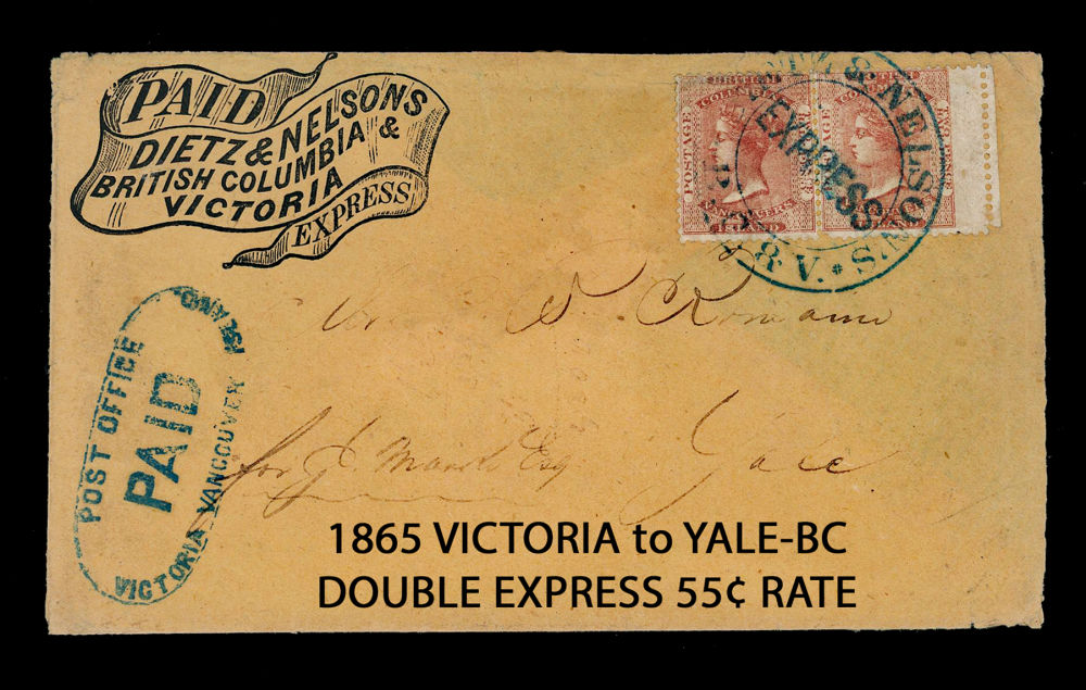 114 image1865 DIETZ & NELSONS EXPRESS B.C & V., blue barrel cancel ties a right margin pair of BC & Vancouver Island #2 stamp on an EXPRESS logo cover, posted from Victoria noting a blue VICTORIA-PAID oval cancel, double rated with 5d postage and 50¢ express fee, addressed to lawyer G. Mark in YALE-BC, a rare cover retails $2100 US ($3000 CDN), part of backflap missing and a rough opening at top is neatly sealed, F-VF est ($1400+ US) (Image)
