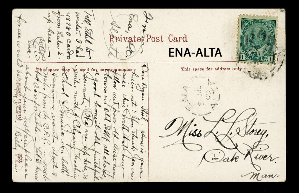 121 image1909 ENA-ALTA (1908-1912 RF-E), split-ring dated JUL-3-1909 on postcard to OAK-RIVER-MAN, retails $75 US ($100 CDN), F-VF est ($50+ US) (Image)