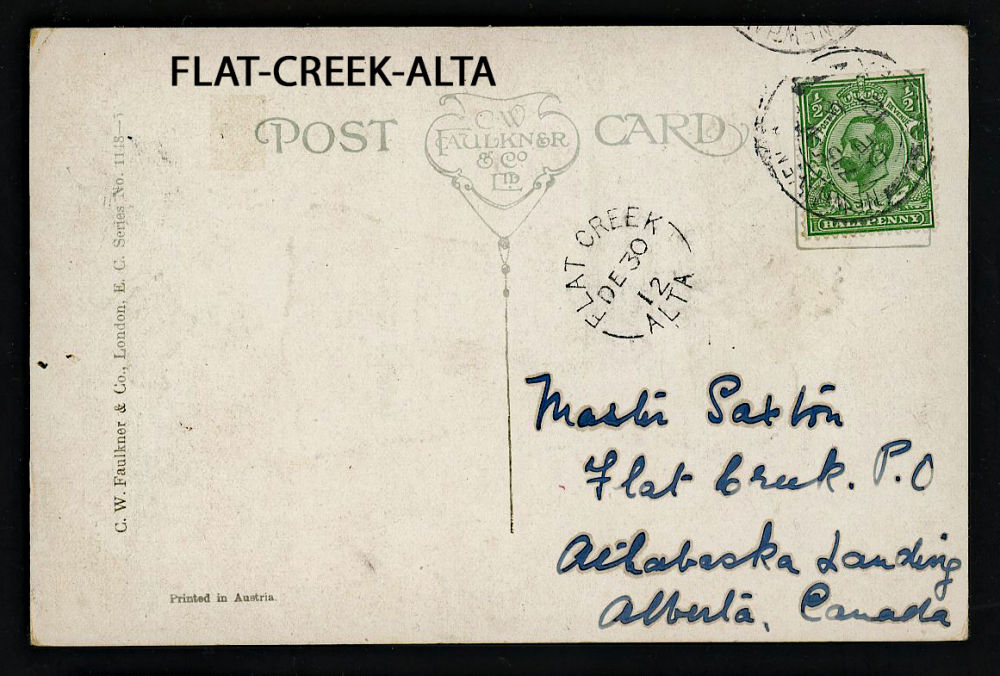 122 image1912 FLAT-CREEK-ALTA (1912-1919 RF-E), split-ring receiver dated DEC-30-1912 on postcard from England, retails $75 US ($100 CDN), F-VF est ($50+ US) (Image)