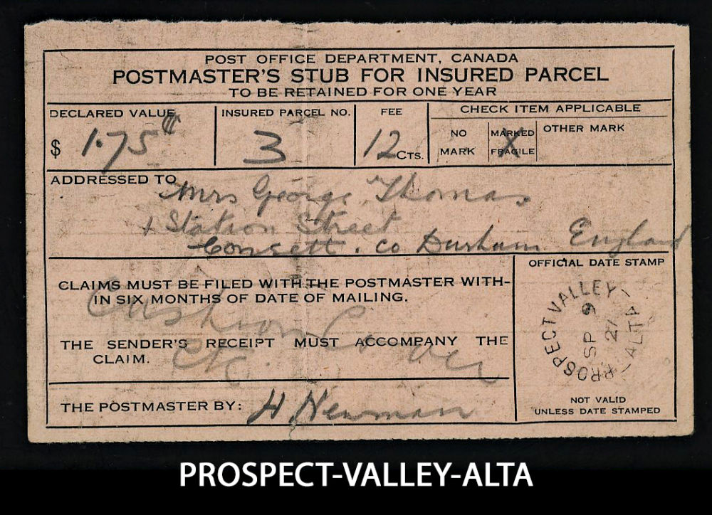123 image1927 PROSPECT-VALLEY-ALTA (1910-1930 RF-E), split-ring dated SEP-9-1927 on an insured parcel receipt, retails $75 US ($100 CDN), F-VF est ($50+ US) (Image)