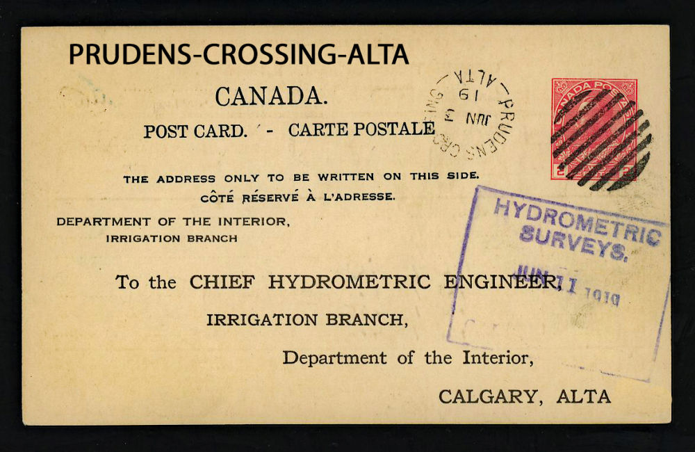 124 image1919 PRUDENS-CROSSING-ALTA (1917-1925 RF-E), split-ring dated JUN-3-1919 on a water level survey card to Calgary, retails $75 US ($100 CDN), F-VF est ($50+ US) (Image)