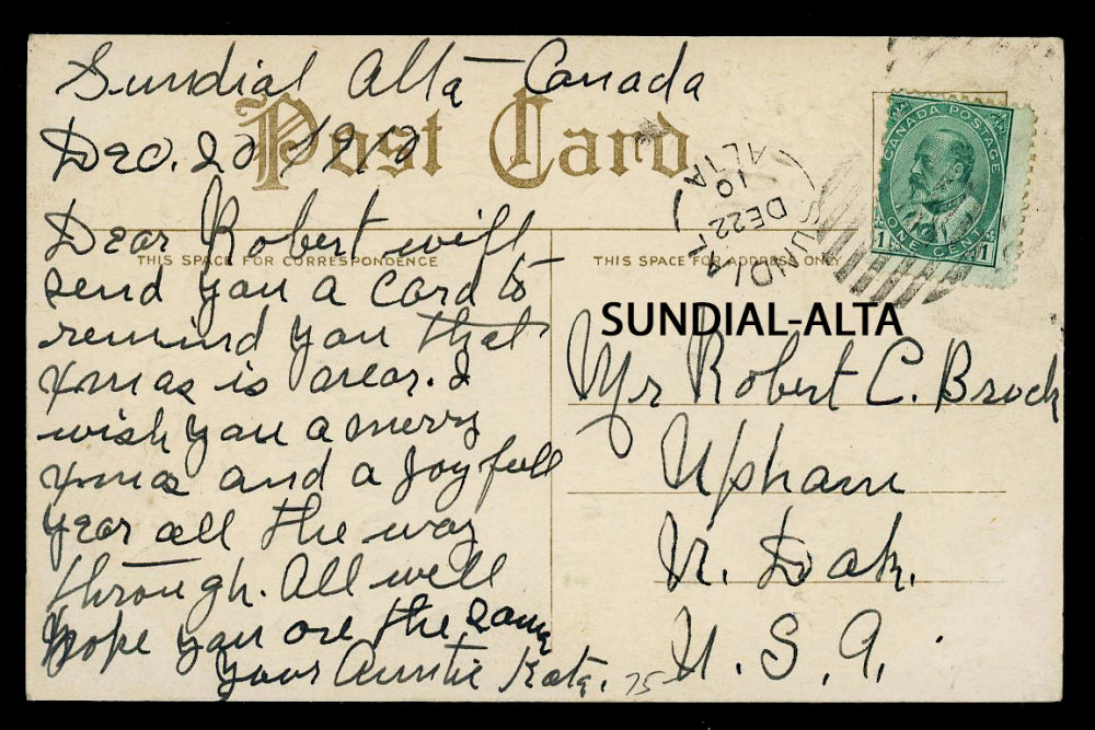 125 image1910 SUNDIAL-ALTA (1908-1916 RF-E), split-ring dated DEC-22-1910 on postcard to USA , retails $75 US ($100 CDN), F-VF est ($50+ US) (Image)