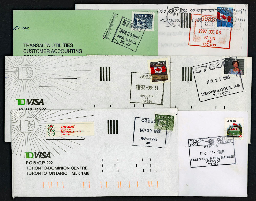 127 image800 ALBERTA POCON TOWN CANCELS 1990-2015 (a few later), the majority are pre-2000 box type POCONS, all are on covers noting 265 are letter size envelopes and 535 legal size, some mild duplication, retails over $1050 US ($1500 CDN), mostly VF est (Image)