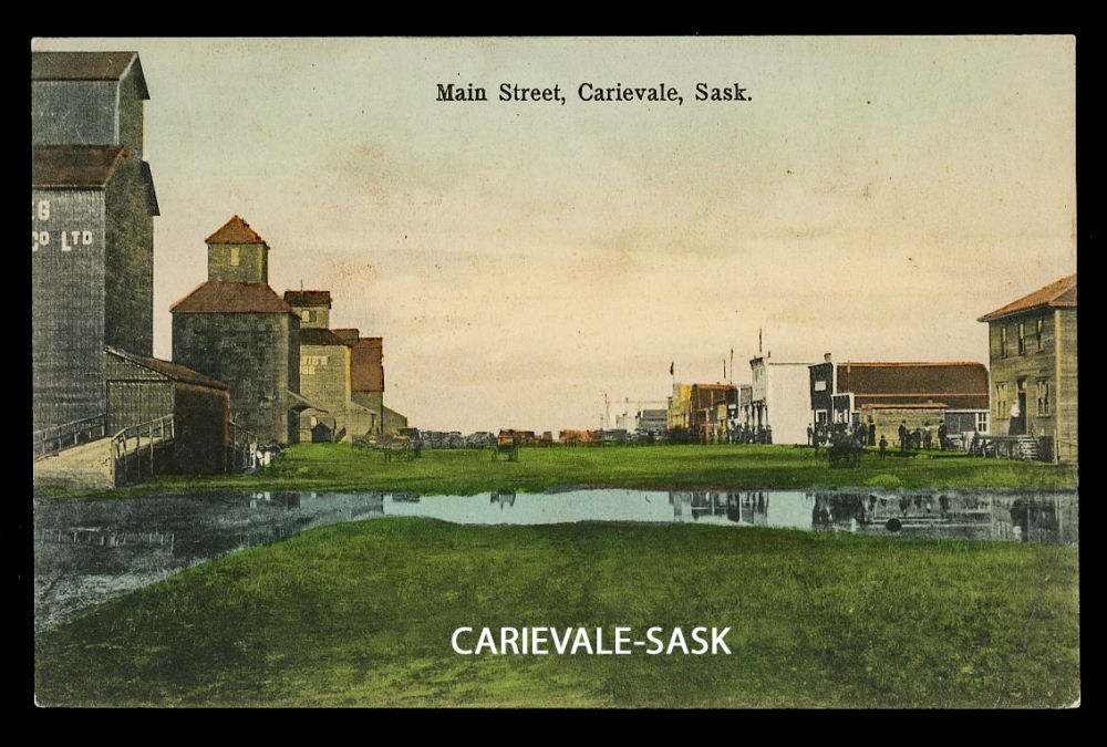 129 image1908 CARIEVALE-SASK MAIN STREET, hand tinted Private Postcard showing a dozen freight wagons and some buggies, plus many well dressed pedestrians on the boardwalk, the street has a large flood and is covered in green grass, possibly the aftermath on a prolonged rain spell, mint with retail $40 US ($60 CDN), F-VF est ($30+ US) (Image)