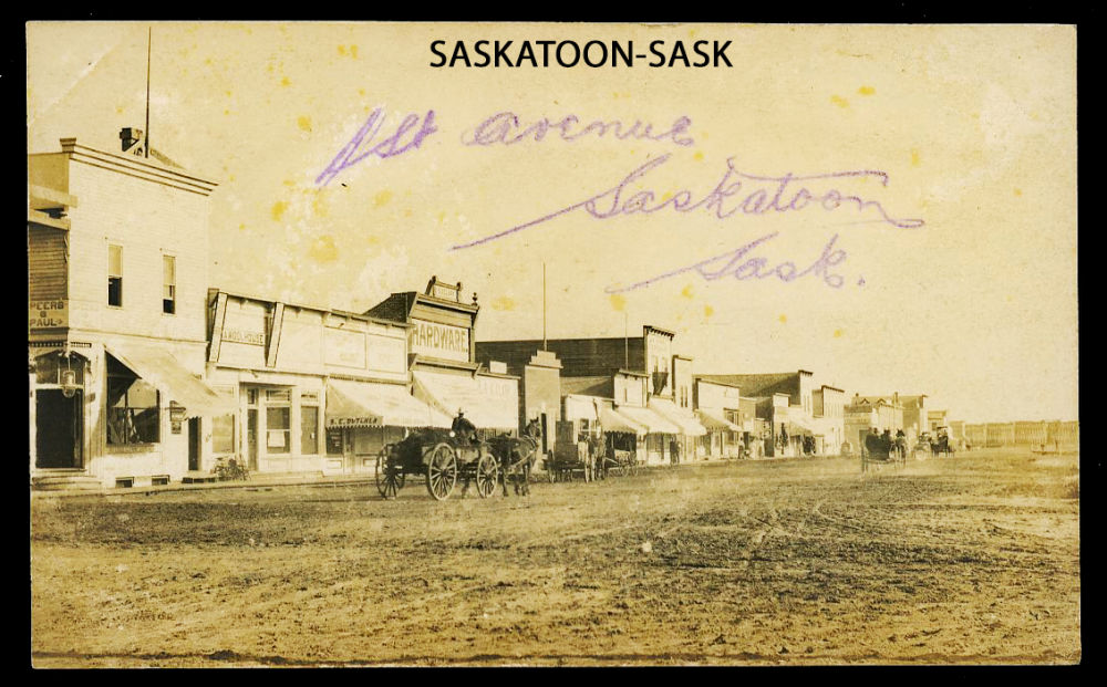 130 image1906 SASKATOON-SASK MAIN STREET, an early real photo card showing 5 horse drawn freight wagons and buggies, plus some readable signs, posted at the train station on NOV-18-1906 with message "Cold as charity here", retails $50 US ($75 CDN), the location in pencil on the photo, F-VF est ($35+ US) (Image)