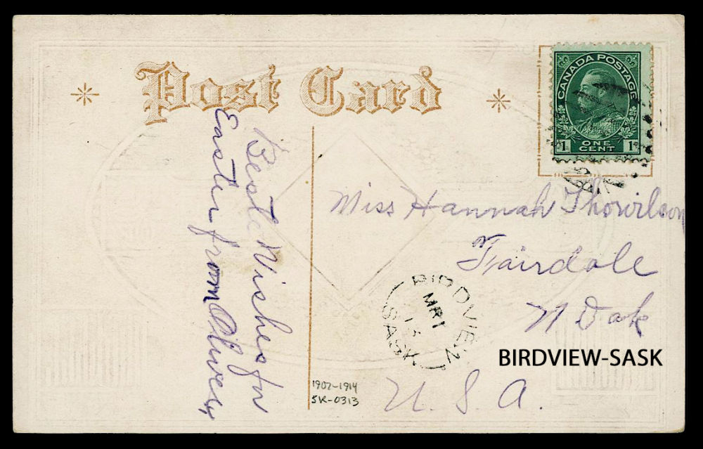 133 image1913 BIRDVIEW-SASK (1907-1914 RF-E), split ring dated 19 on postcard to USA, retails $75 US ($100 CDN), F-VF est ($50+ US) (Image)