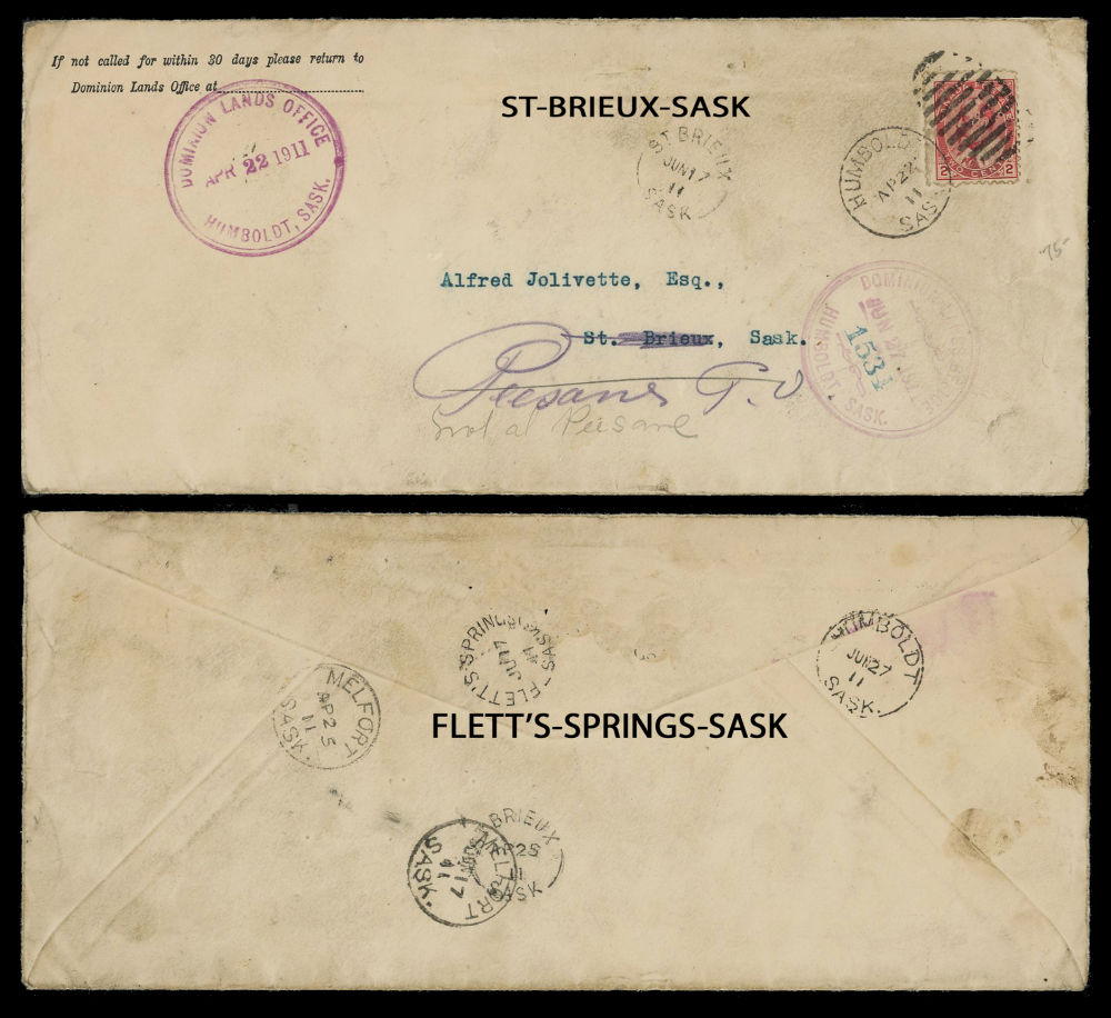 134 image1911 FLETT'S-SPRINGS-SASK (1875-1918 RF-E), split ring transit dated JUN-17-1911 on a returned Humboldt Dominion Land Office legal size cover, other transits included Melfort-Sask and St-Brieux-Sask, retails $100 US ($150 CDN), F-VF est ($75+ US) (Image)