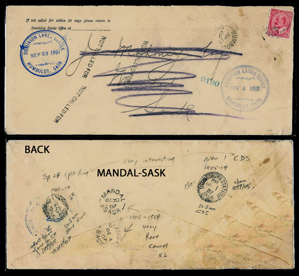 138 image1907 MANDAL-SASK (1906-1908 RF-E), split ring dated OCT-30-1907 on a returned Humboldt Dominion Land Office legal size cover, other transits included Strassburg-Station-Sask (RF-D), a rare cancel retails $100 US ($150 CDN), F-VF est ($75+ US) (Image)