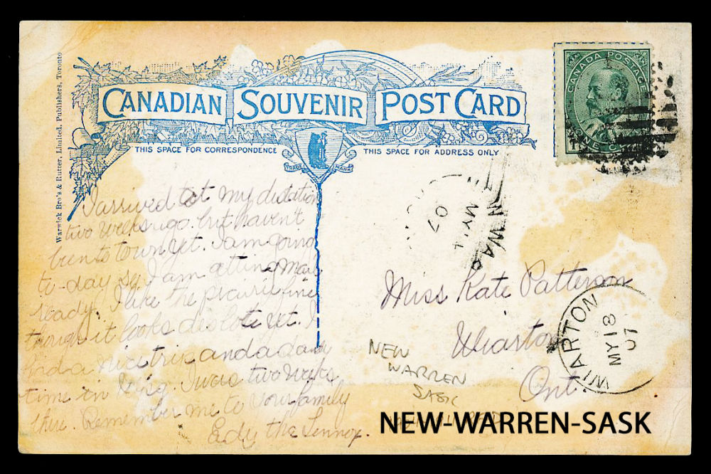 139 image1907 NEW-WARREN-SASK (1904-1911 RF-D), split ring dated MAY-14-1907 on postcard to Warton-Ont, retails $50 US ($75 CDN), some toning, F-VF est ($35+ US) (Image)