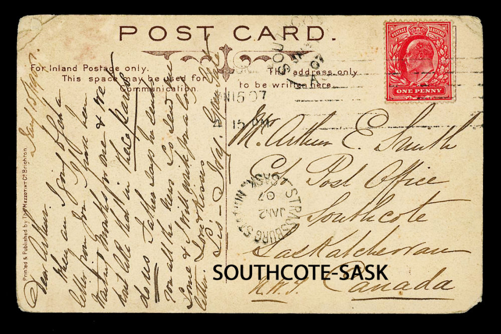 140 image1907 SOUTHCOTE-SASK (1905-1909 RF-E ), split ring receiver dated JAN-21-1907 on postcard from England, also note a Strassburg-Station-Sask (RF-D) transit on JAN-20, retails $75 US ($100 CDN), F-VF est ($50+ US) (Image)