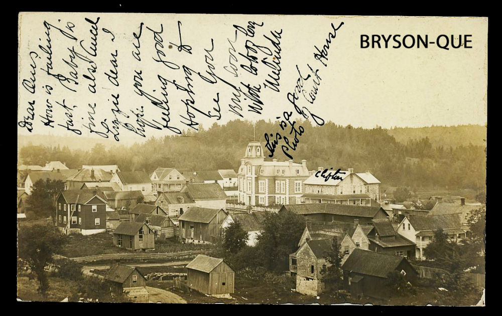 161 image1903 BRYSON-QUE, an early real photo Private Postcard showing a view of the town, the court house is identified, message on the picture side, dated JAN-8-1903 and addressed to USA, retails $75 US ($100 CDN), F-VF est ($50+ US) (Image)