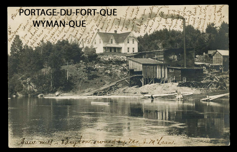 163 image1906 PORTAGE-DU-FORT-QUE, real photo card showing the sawmill and owner's house, message on the picture side, postally used APR-21-1906 to WYMAN-QUE on APR-24, retails $75 US ($100 CDN), F-VF est ($50+ US) (Image)