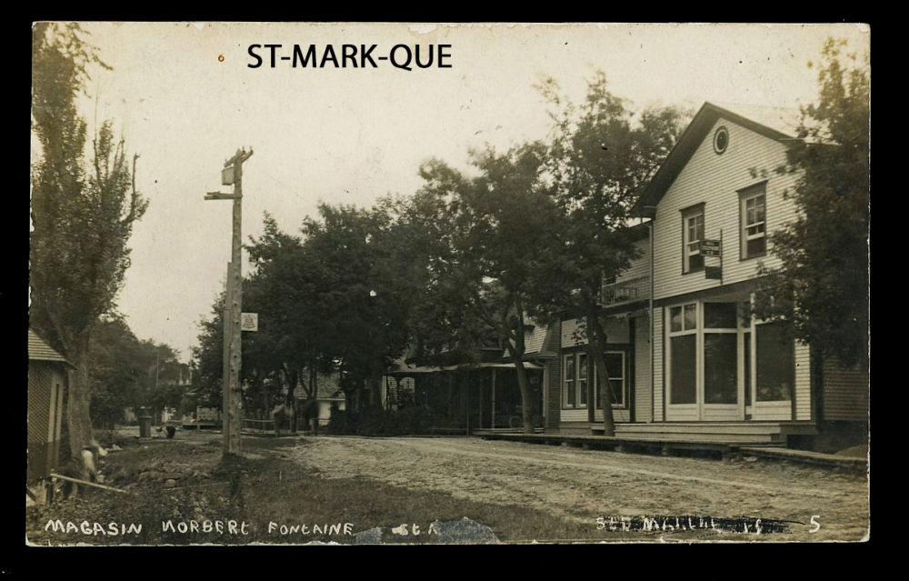 164 image1908 ST-MARK-QUE, real photo card showing the Norbert Fontaine store, a Bell telephone sign on the power pole, message on back but not posted, retails $75 US ($100 CDN), F-VF est ($50+ US) (Image)