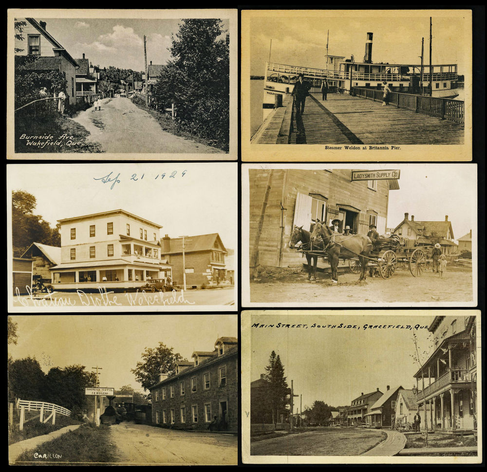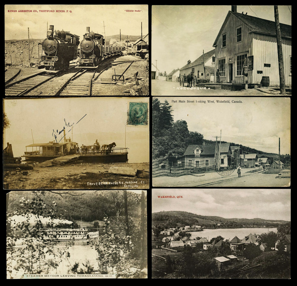 165 image29 QUEBEC POSTCARDS 1906-1930's, street and building views including a nice group of 6 Kazubazue cards, 13 Wakefield cards, a good Thetford-Mines card showing the railroad, 1909 Ladysmith real photo card timber related with message , also a card showing the Pointe-Fortune & Carillon river ferry, views of Gracefield, Hotel Severeign at Carillon, steamer "WELDON" at Britannia Pier, steamer "METEOR" at Temaskaming ++, not counted are 37 duplicate chrome cards showing the summer home of Prime Minister William L. M. King, retails over $250 US ($350 CDN), F-VF est (Image) (image 165b) (All Images)