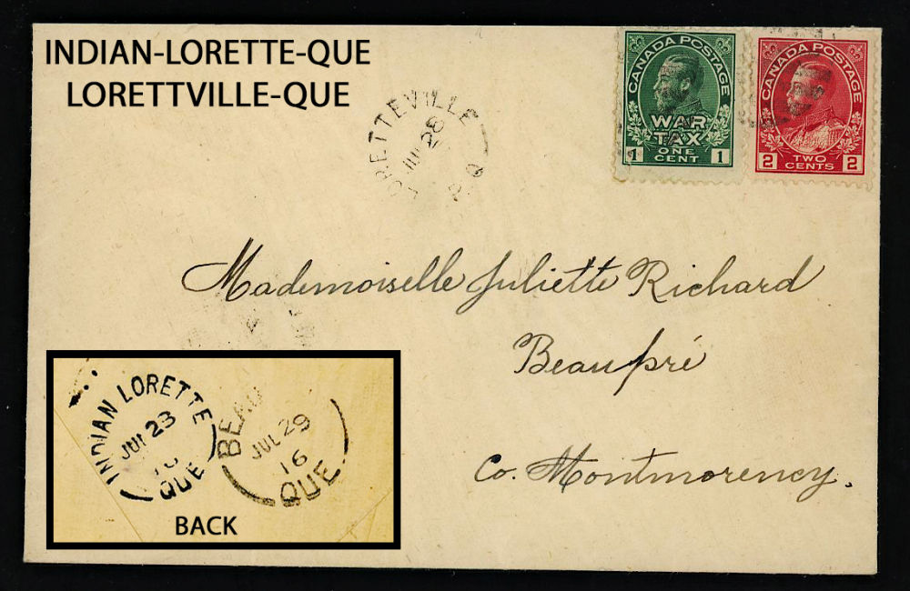 167 image1916 LORETTVILLE-QUE (QUE 1915-1921), split ring dated JUL-28-1916 on cover to Beaupre-Que on JUL-29, routing via INDIAN-LORETTE-QUE (QUE 1893-1921) with split-ring transit dated JUL-28, 2 scarce cancels retailing $50 US ($75 CDN), F-VF est ($35+ US) (Image)