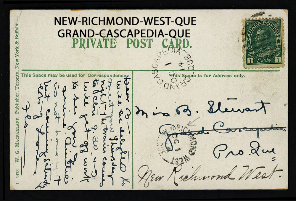 168 image1914 NEW-RICHMOND-WEST-QUE (BON 1910-1916 ), split ring receiver dated OCT-1-1914 on MacFarlane published Private Postcard from Campbellton-NB, originally sent to Grand-Grand-Cascapedia-Que and redirected, retails $50 US ($75 CDN), F-VF est ($35+ US) (Image)