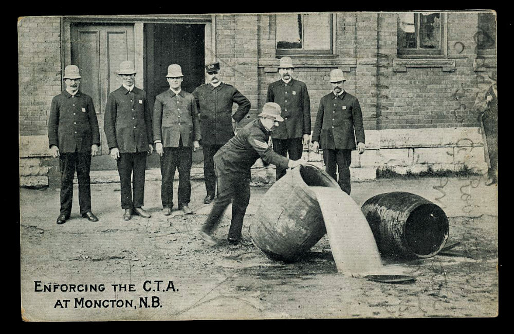 169 image1908 MONCTON-NB PROHIBITION, P. D. Ayre published card showing the Moncton police sergeant dumping liquor in the sewer with the police chief and 5 officers onlooking, posted at Moncton on DEC-9-1908, scarce card retailing $75 US ($100 CDN), F-VF est ($50+ US) (Image)