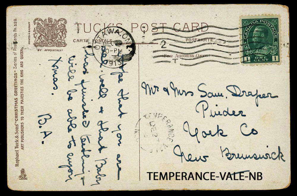 170 image1913 TEMPERANCE-VALE-NB (York 1912-1925), split ring transit dated DEC-23-1913 on a Tuck postcard from Ottawa to Puider-NB, retails $50 US ($75 CDN), F-VF est ($35+ US) (Image)
