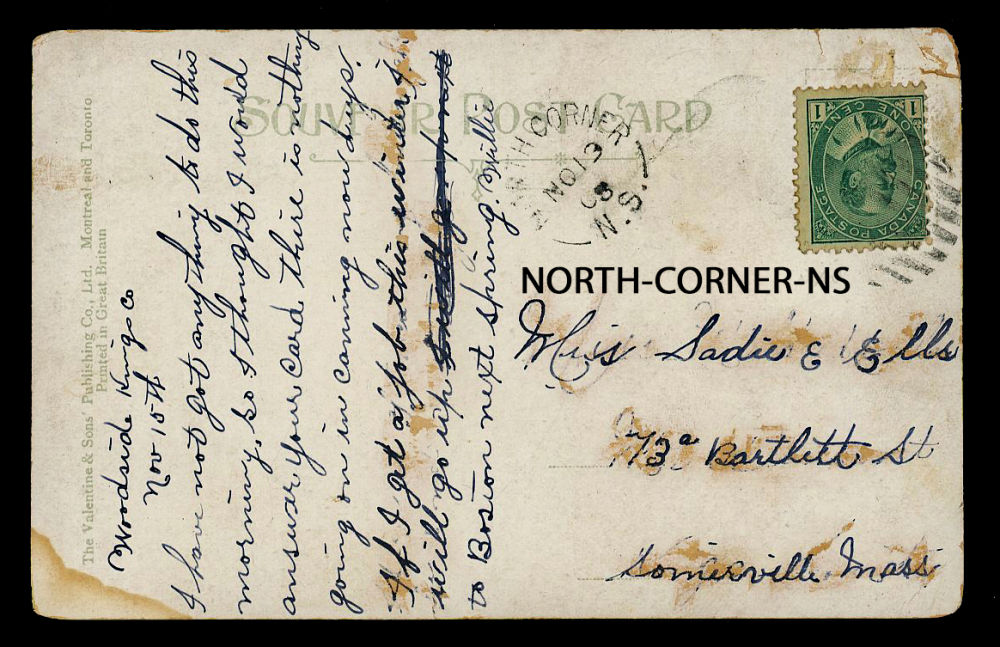 171 image1908 NORTH-CORNER-NS (Kings 1903-1917), split ring dated NOV-13-1908 on postcard to USA, retails $75 US ($100 CDN), F-VF est ($35+ US) (Image)