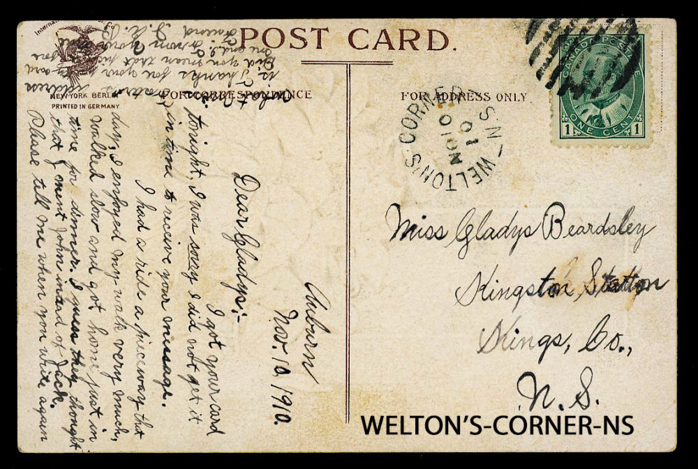 172 image1910 WELTON'S-CORNER-NS (Kings 1899-1921), split ring dated NOV-10-1910 on postcard to Kingston-Station-NS, retails $75 US ($100 CDN), F-VF est ($35+ US) (Image)