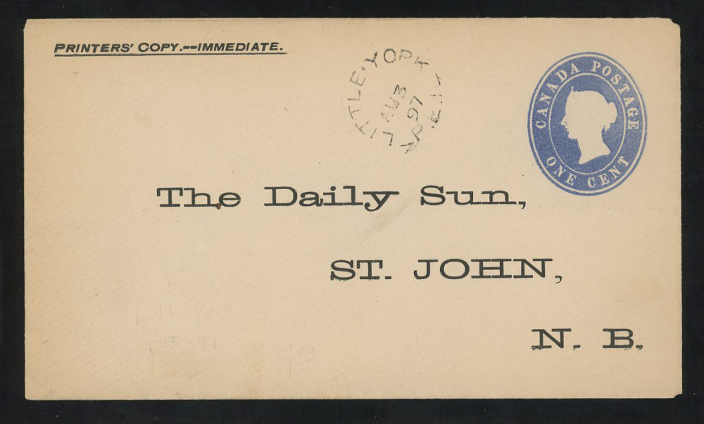 174 image1897 PRINTERS COPY at LITTLE-YORK-PEI (Queens 1872), split ring dated AUG-3-1897 on unsealed 1¢ rate to the Daily Sun newspaper at St-John-NB, scarce town cancel retailing $75 US ($100 CDN), VF est ($35+ US) (Image)