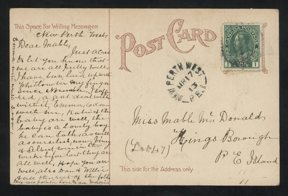 175 image1913 NEW-PERTH-WEST-PEI (Kings 1904-1914 RF-E), scarce cancel retailing $75 US ($100 CDN), F-VF est ($50+ US) (Image)