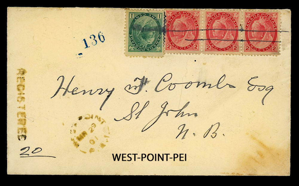 177 image1901 WEST-POINT-PEI (Prince 1871-1914 RF-D), split ring dated MAR-29-1901 on registered cover to ST-JOHN-NB with arrival APR-2, retails $75 US ($100 CDN), VF est ($50+ US) (Image)