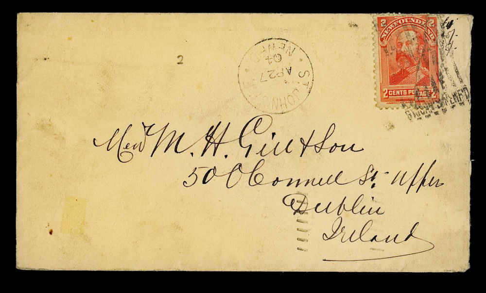 178 image1904 NEWFOUNDLAND to IRELAND, cover from ST-JOHN'S on APR-27-1904 and addressed to Dublin, #81 pays the 2¢ Empire rate with routing via Halifax on APR-30 and Dublin H. & K. PACKET arrival MAY-10, retails $75 US ($100 CDN), F-VF est ($50+ US) (Image)